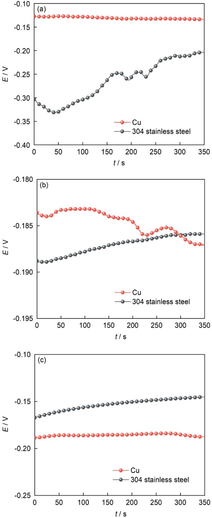 为了证明上述Cu和304不锈钢在电偶腐蚀过程中会发生阴阳极极性变化的假设,对Cu和304不锈钢在电偶腐蚀过程中0、6和12 h时各自的OCP进行测量 (测试时断开,测完后再连接),结果如图8所示。图8a显示在开始浸泡时,Cu电极电位比较稳定,在-0.130 V左右,而304不锈钢电位逐渐正移,但一直低于Cu,表明开始浸泡时Cu为阴极,304不锈钢为阳极;当电偶腐蚀6 h时 (图8b),Cu与304不锈钢表面OCP比较接近,在-0.185左右,表明此时阴阳极金属偶接后极化程度降低,腐蚀较为缓慢,这也能解释图6c和g,以及图7中Cu和304不锈钢表面pH接近的结果;当电偶腐蚀12 h时 (图8c),Cu电极的OCP低于304不锈钢,表明偶接时Cu为阳极,发生阳极溶解,304不锈钢为阴极,在表面发生质子还原和氧还原过程,这种Cu和304不锈钢电偶腐蚀过程中极性反转可以充分的解释面扫描 (图6) 和线扫描 (图7) 的结果。