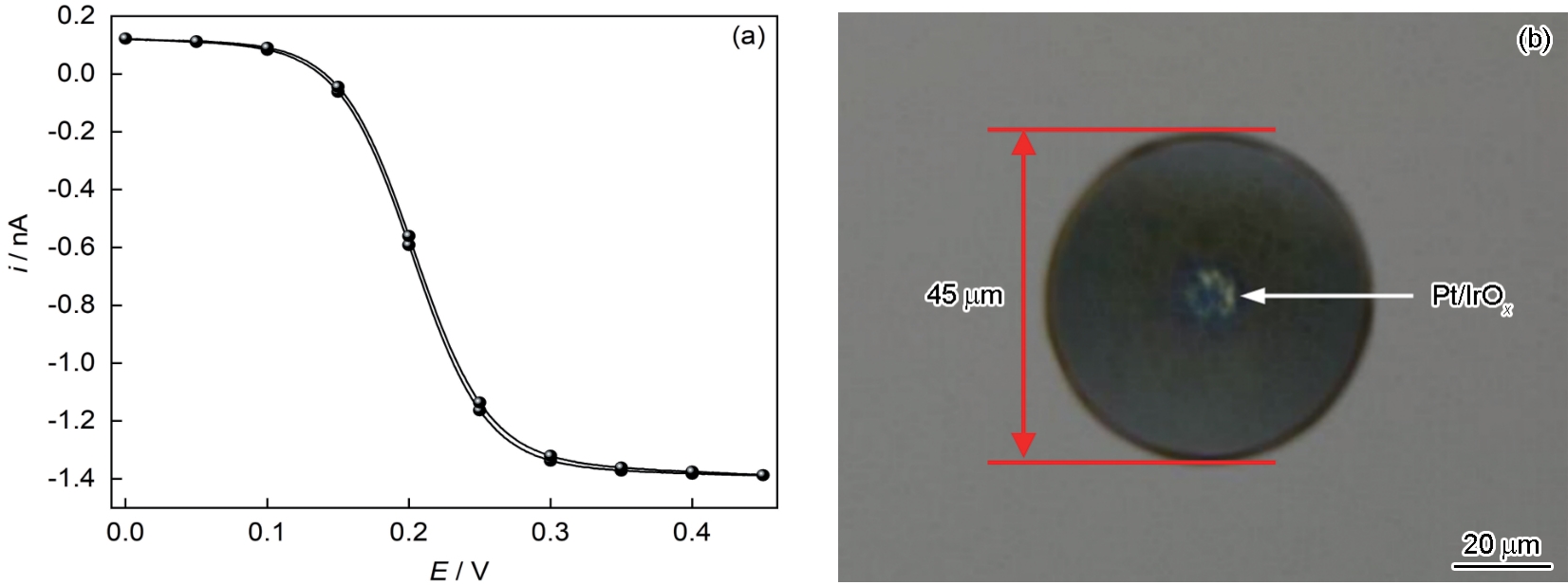 | 图1 直径10 μm Pt UME在1 mmol/L FcMeOH+0.1 mol/L KNO3溶液中CV曲线及沉积IrO x 后电极端面光学形貌 |