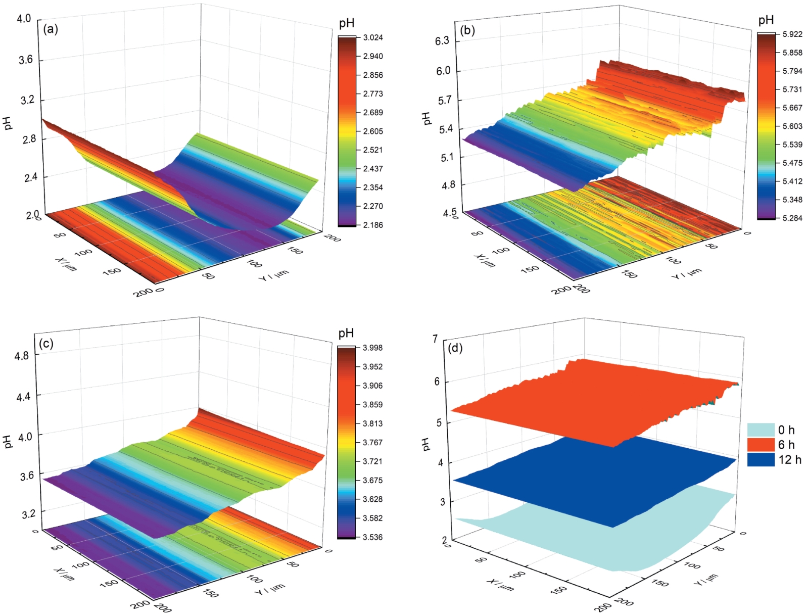 | Fig.4 Surface scanning diagram of Cu electrode in 3.5% NaCl solution with pH=2.00 after immersion for 0 h (a), 6 h (b), 12 h (c), and comparison of surface scanning of Pt/IrO x -pH microsensor electrode on Cu surface with distance of 5 μm in the three immersion times (d) |