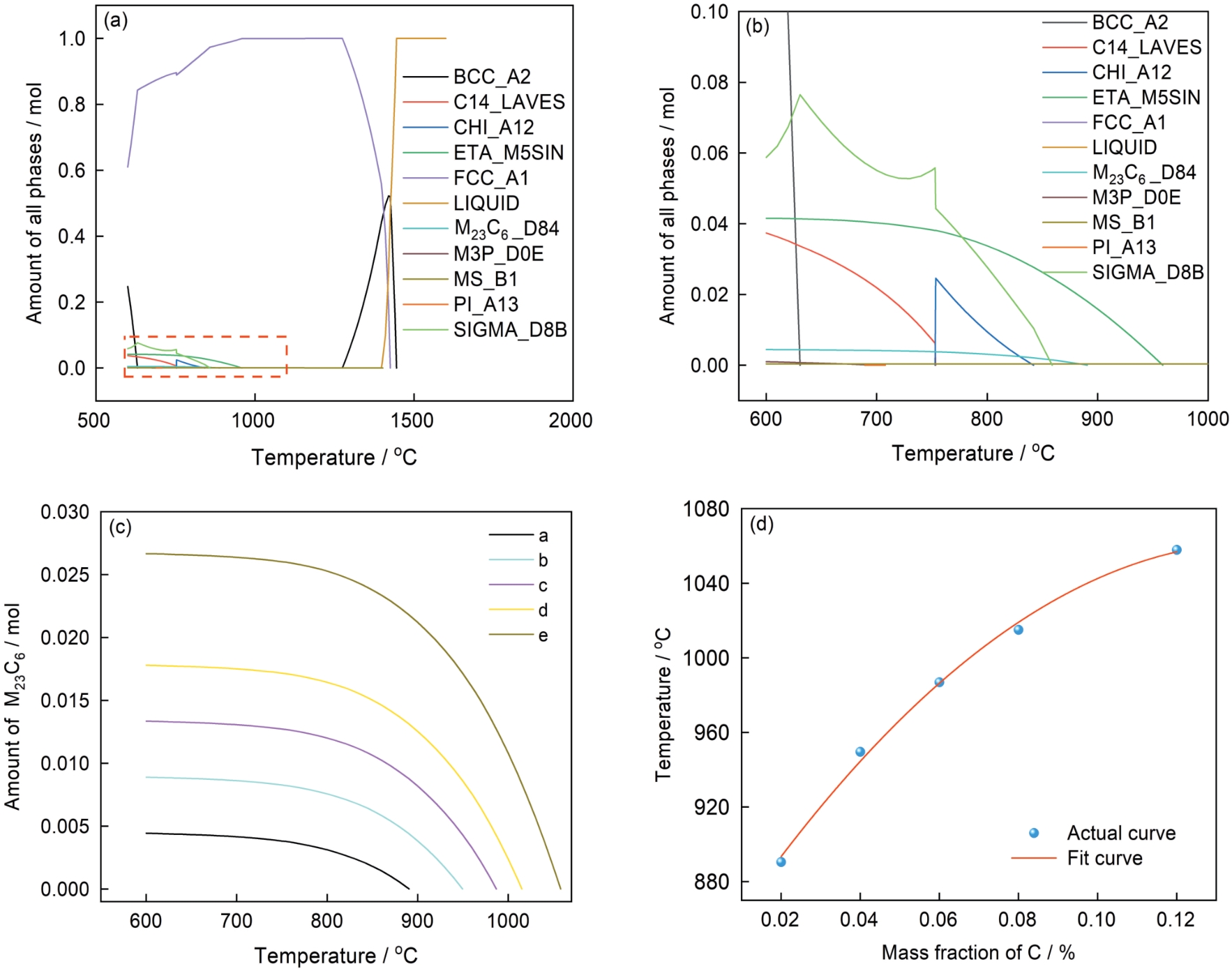 | Fig.1 Thermal-Calc results of the 316L stainless steels with different C contents: (a) thermodynamic equilibrium phase diagram, (b) magnified view of marked region in Fig.1a, (c) thermodynamic curves for M23C6, (d) relationship between the C content and solution temperature for M23C6 |