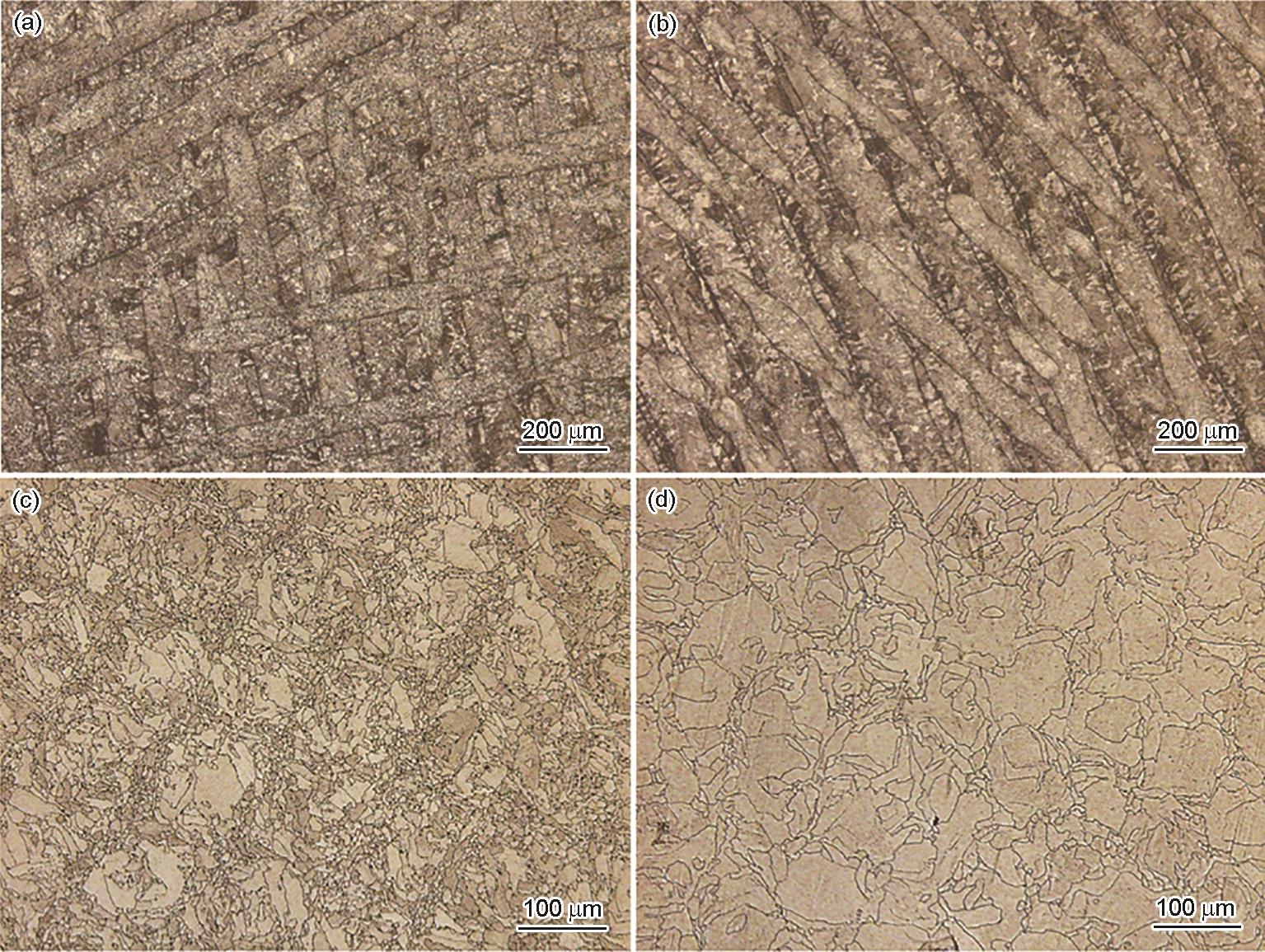 | Fig.2 Microstructure of SLM 316L stainless steel after different heat treatments: (a) 1# as-received, (b) 2# as-received, (c) 1# 900 ℃×5 h, (d) 2# 900 ℃×5 h |