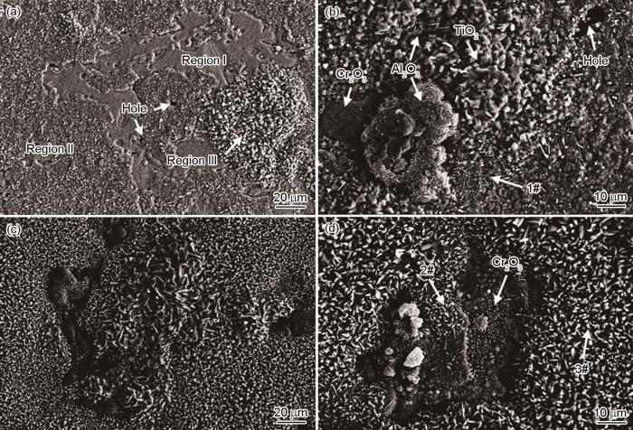 图11 为 (Cr2/3 Ti1/3 )3 AlC2 在1000 和1200 ℃下水蒸气中氧化1 h后的表面微观形貌。(Cr2/3 Ti1/3 )3 AlC2 样品在1000 ℃下氧化后,表面依然平整,存在少量孔洞,氧化膜呈现3种不同形貌:区域I致密平整;区域II由细小致密的晶粒组成,表面还可观察到少量细小针状氧化物;区域III为晶粒粗大的针状凸起 (图11a )。结合DES结果可知,1000 ℃下氧化后表面的片状凸起为Al2 O3 ,具有粗大晶粒的针状凸起为TiO2 ,平整致密区域为Cr2 O3 ,细小晶粒区域的主要元素为Cr、Ti、O和少量Al (见表1 )。在1200 ℃下氧化后,(Cr2/3 Ti1/3 )3 AlC2 样品表面基本被针状TiO2 覆盖,少部分区域暴露出内层氧化物Cr2 O3 ,针状氧化物垂直表面生长,并不致密 (图11c )。从表1 中可见,针状氧化物主要元素为Cr、Ti、O和少量Al,不同区域Cr和Ti的相对含量存在差别,靠近Cr2 O3 的区域Cr含量更高。