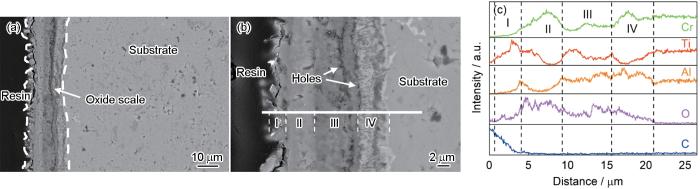 Cross-sectional morphologies (a, b) and corresponding element profiles (c) of (Cr2/3 Ti1/3 )3 AlC2 after oxidation at 1000 ℃ in water vapor