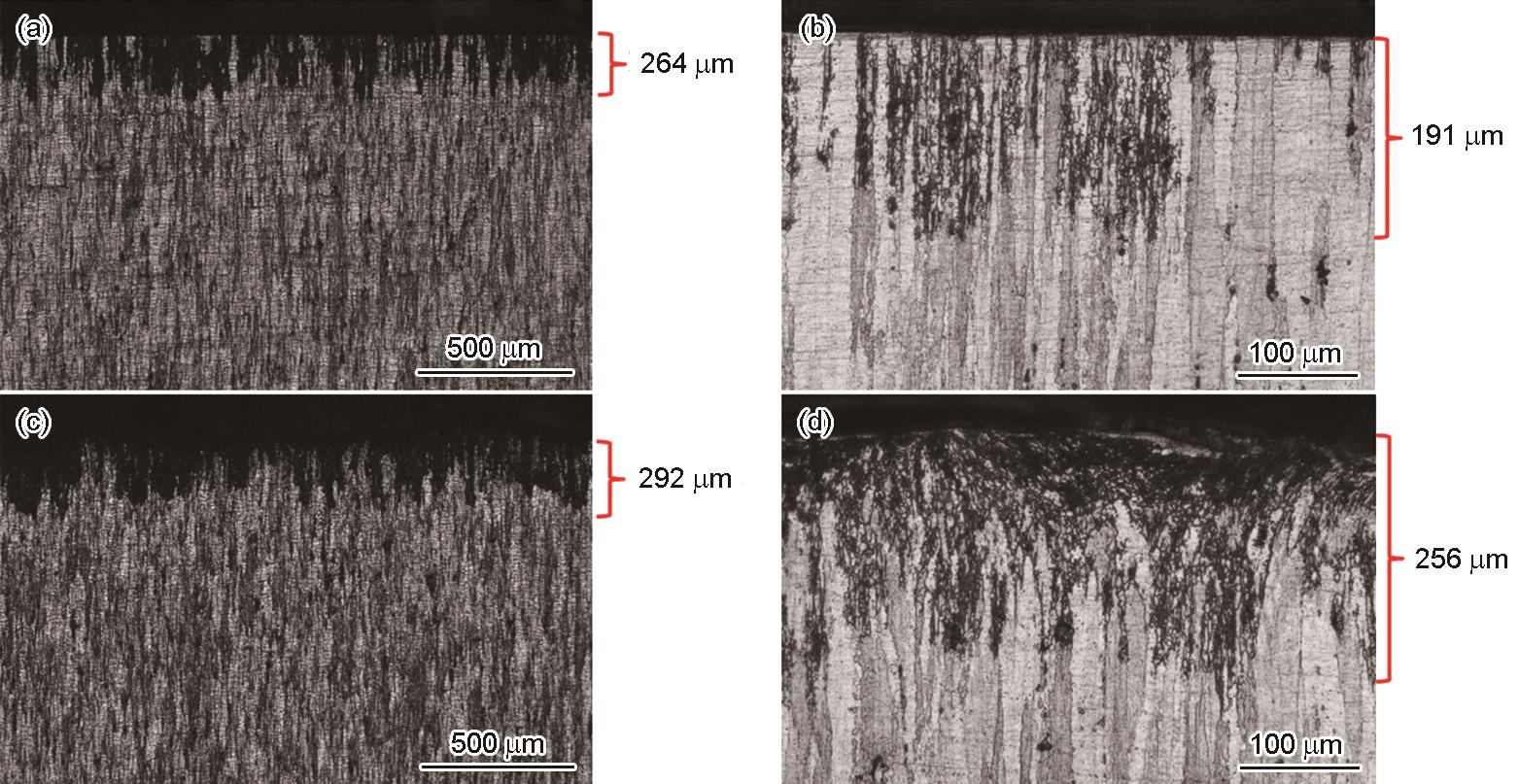 | Fig.10 Cross-sectional optical micrographs of 7075 Al- alloys after IGC test: (a) 6 h and (b) 2 h immersion of the untreated sample, (c) 6 h and (d) 2 h immersion of the peened sample |