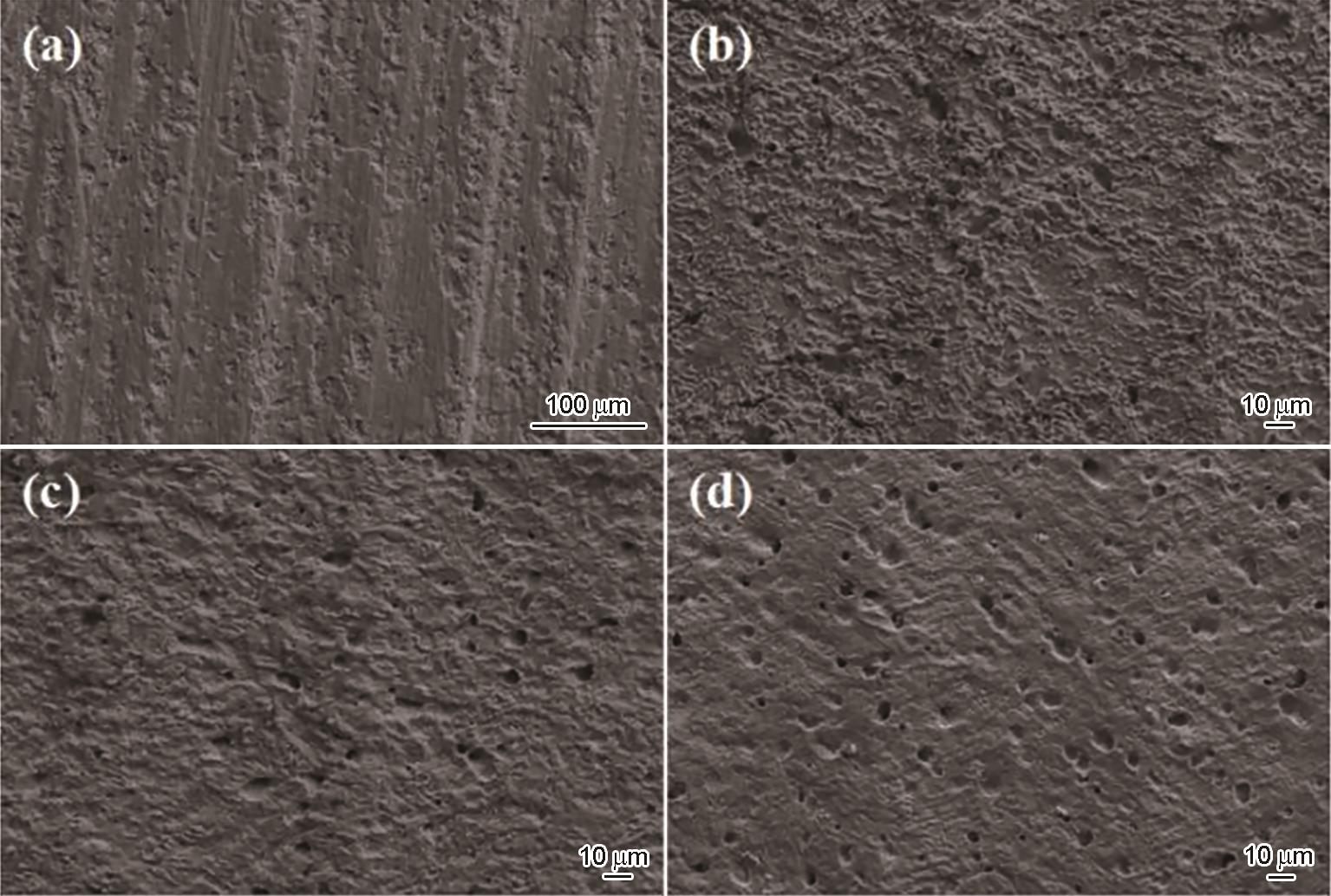 | Fig.8 SEM micrographs of ZCuSn5Pb5Zn5 without corrosion products: (a) 0 m/s, (b) 1 m/s, (c) 3 m/s, (d) 5 m/s |