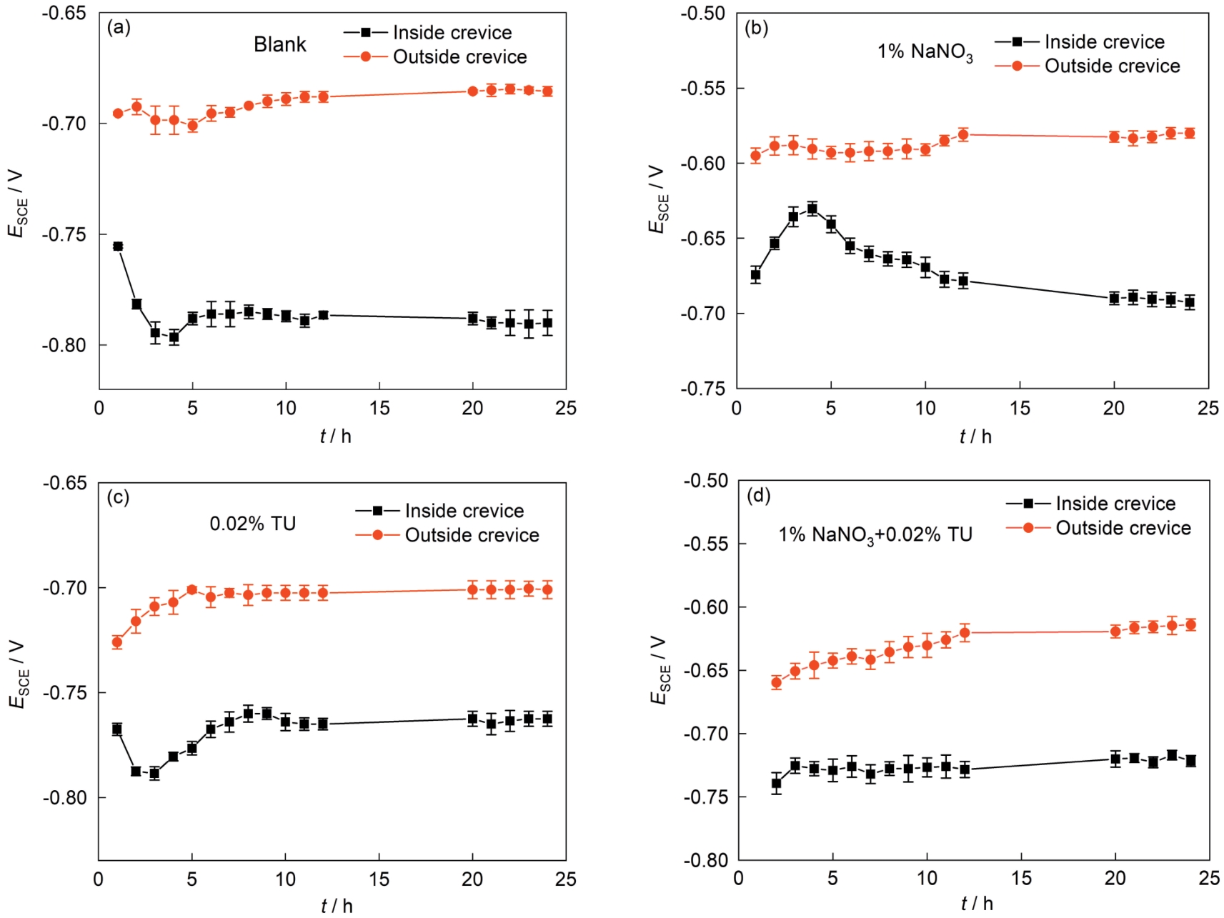 | Fig.5 Curves of potential change inside and outside the crevice of 7075 Al-alloy immersed in blank (a), 1% NaNO3 (b), 0.02% TU (c) and 1% NaNO3+0.02% TU (d) solutions for 24 h |