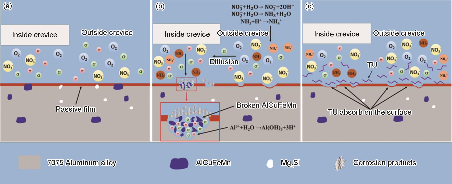 | Fig.7 Mechanism of crevice corrosion of 7075 Al- alloy in blank (a), NaNO3 (b) and NaNO3+0.02% TU (c) solutions |