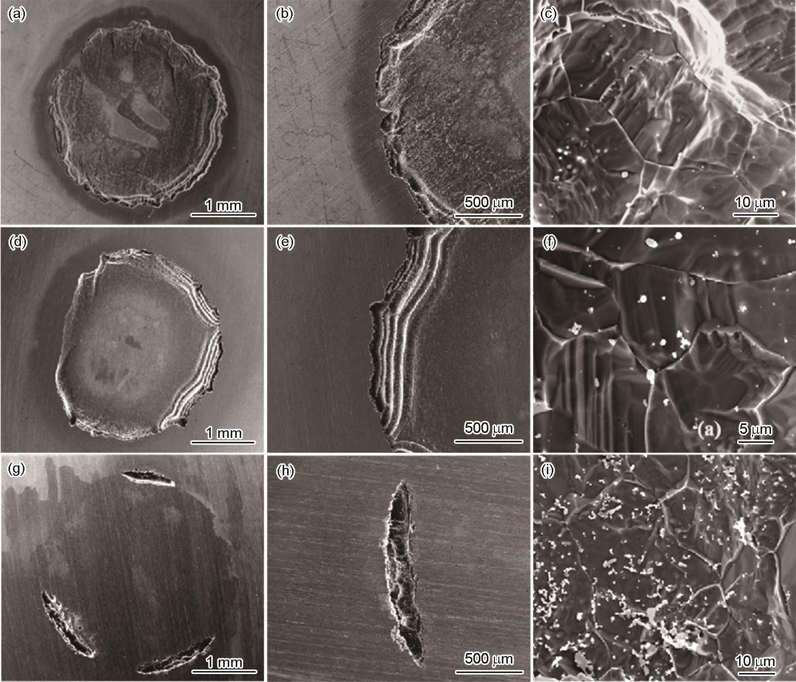 | Fig.7 Microscopic corrosion morphologies of 316L-316L (a-c), 316L-PTFE (d-f), and 316L-NBR (g-i) crevice samples after electrochemical tests |