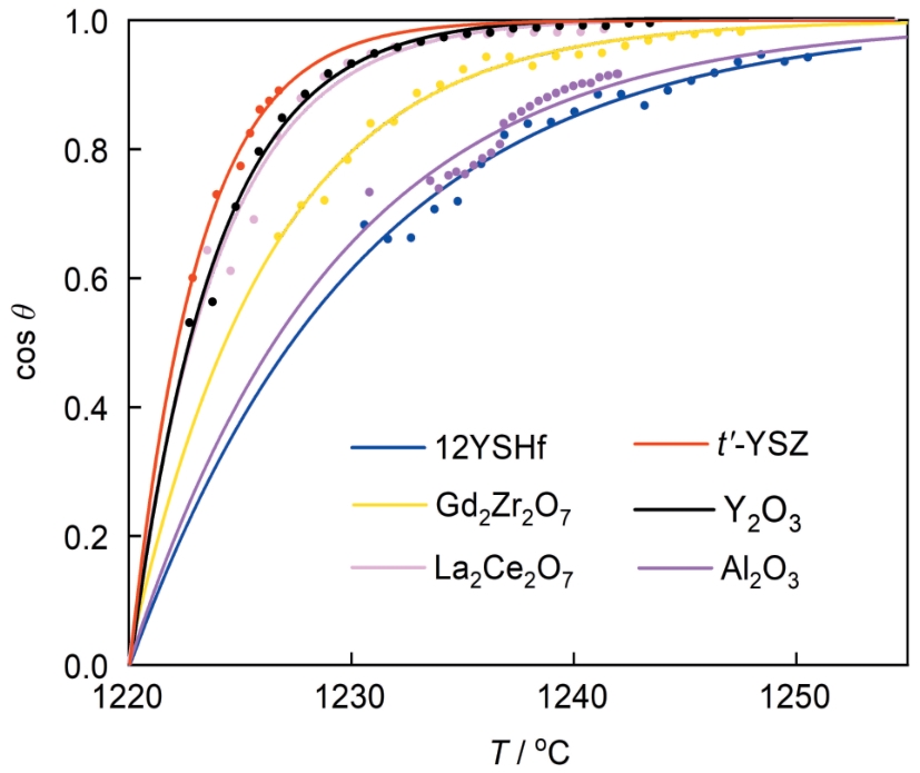 | 图2 CMAS熔体在不同陶瓷材料表面接触角余弦值随温度的变化曲线 |