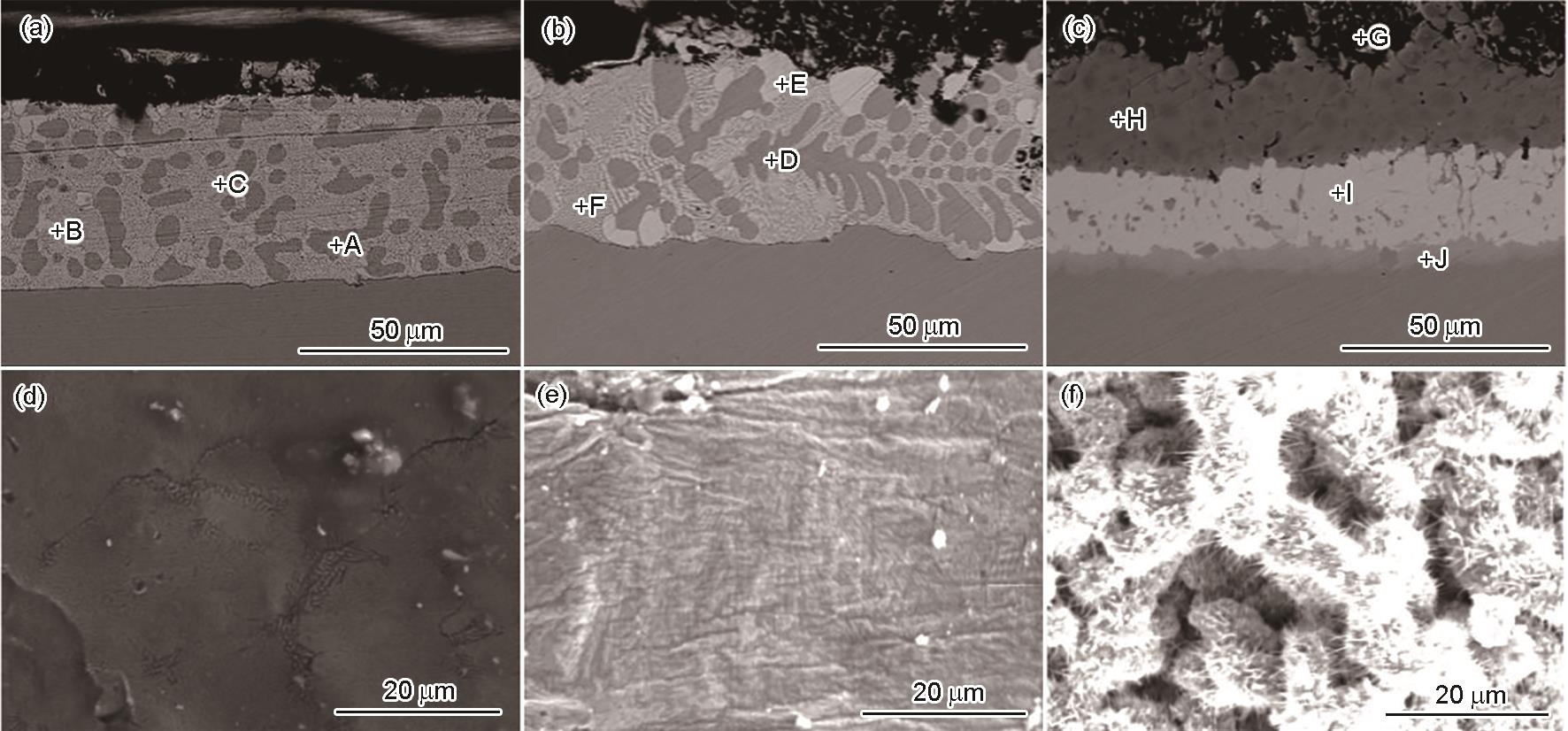 Fig.1 Cross-sectional (a-c) and surface (d-f) morphologies of the ZnAlMg coating after 0 ℃ (a, d), 500 ℃ (b, e) and 700 ℃ (c, f) heat treatment |