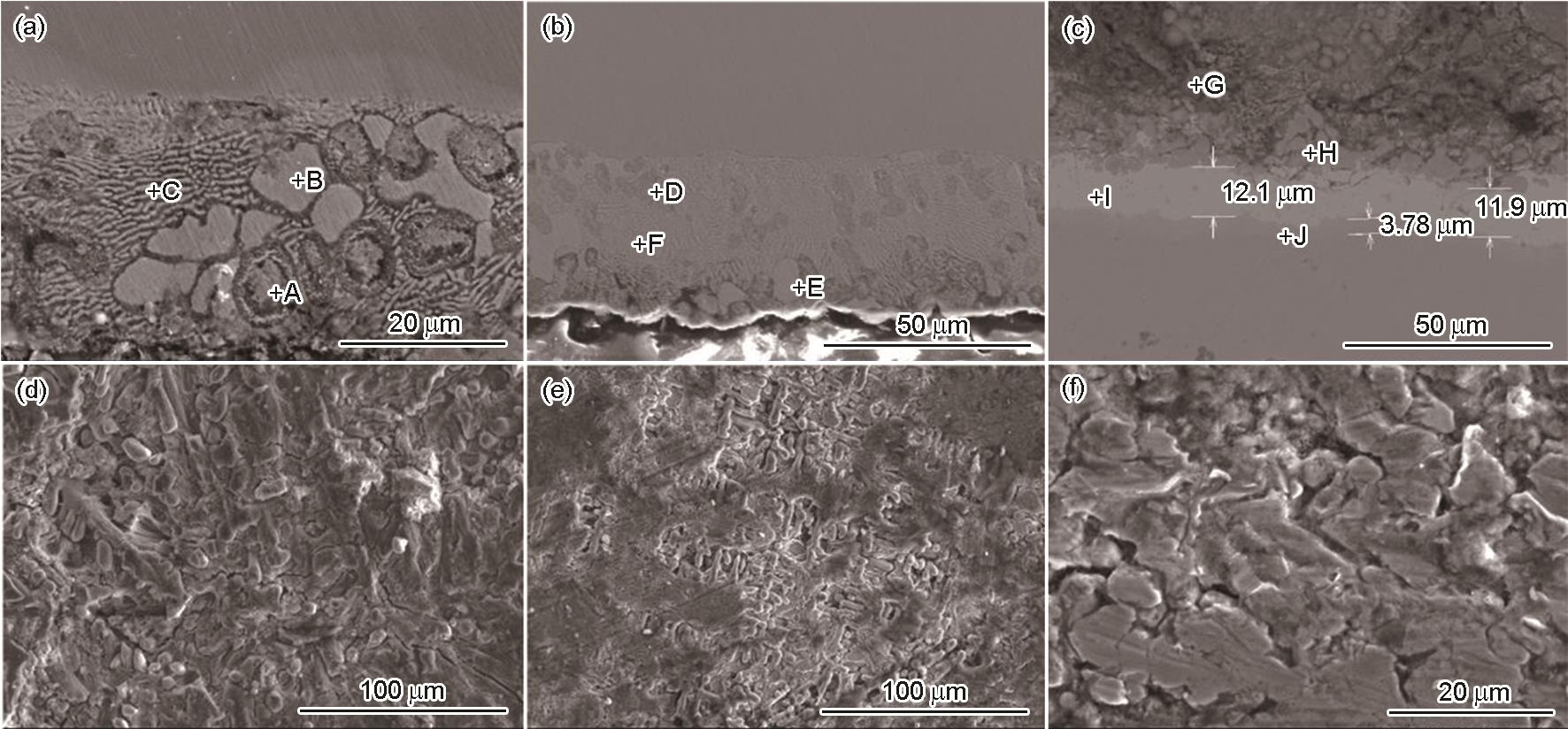 Fig.4 Cross-sectional (a-c) and surface (d-f) morphologies of the ZnAlMg coating heated at 0 ℃ (a, d), 500 ℃ (b, e) and 700 ℃ (c, f) after 1350 h corrosion in neutral salt spray test |