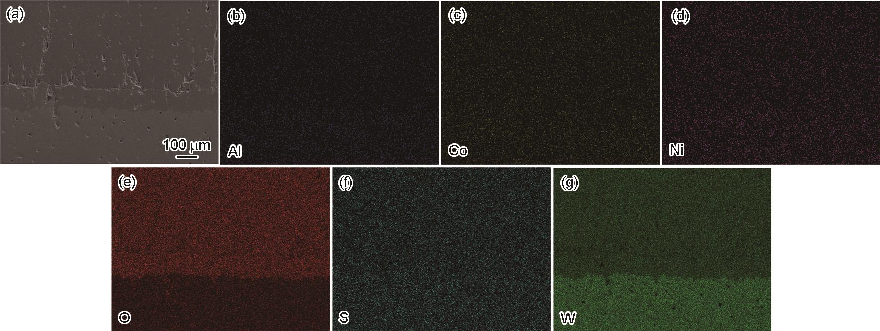 | Fig.6 SEM morphology of the alloy A after hot corrosion in 75% Na2SO4+25% NaCl at 900 °C for 32 h (a), and EDS mappings of Al (b), Co (c), Ni (d), O (e), S (f) and W (g) |
