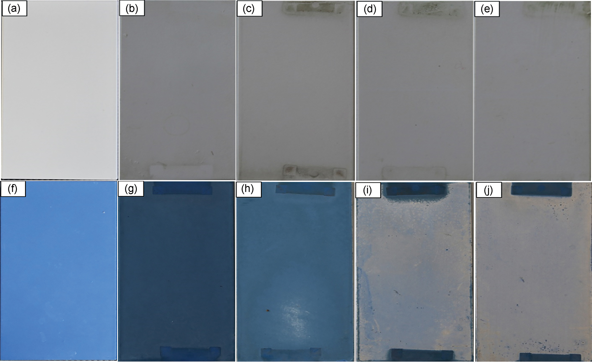 | Fig.1 Macroscopic morphologies of coating 1 (a-e) and coating 2 (f-j) sample after 0 a (a, f), 0.5 a (b, g), 1 a (c, h), 2 a (d, i), 2.5 a (e, j) of exposure at Wanning natural environment test station |
