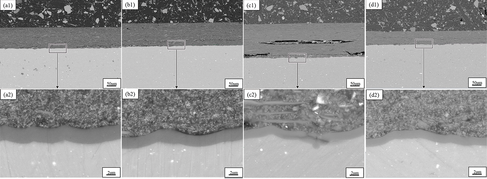 | Fig.3 Cross-section morphologies of coating 1 sample after 0.5 a (a), 1 a (b), 2 a (c), 2.5 a (d) of exposure at Wanning natural environment test station |