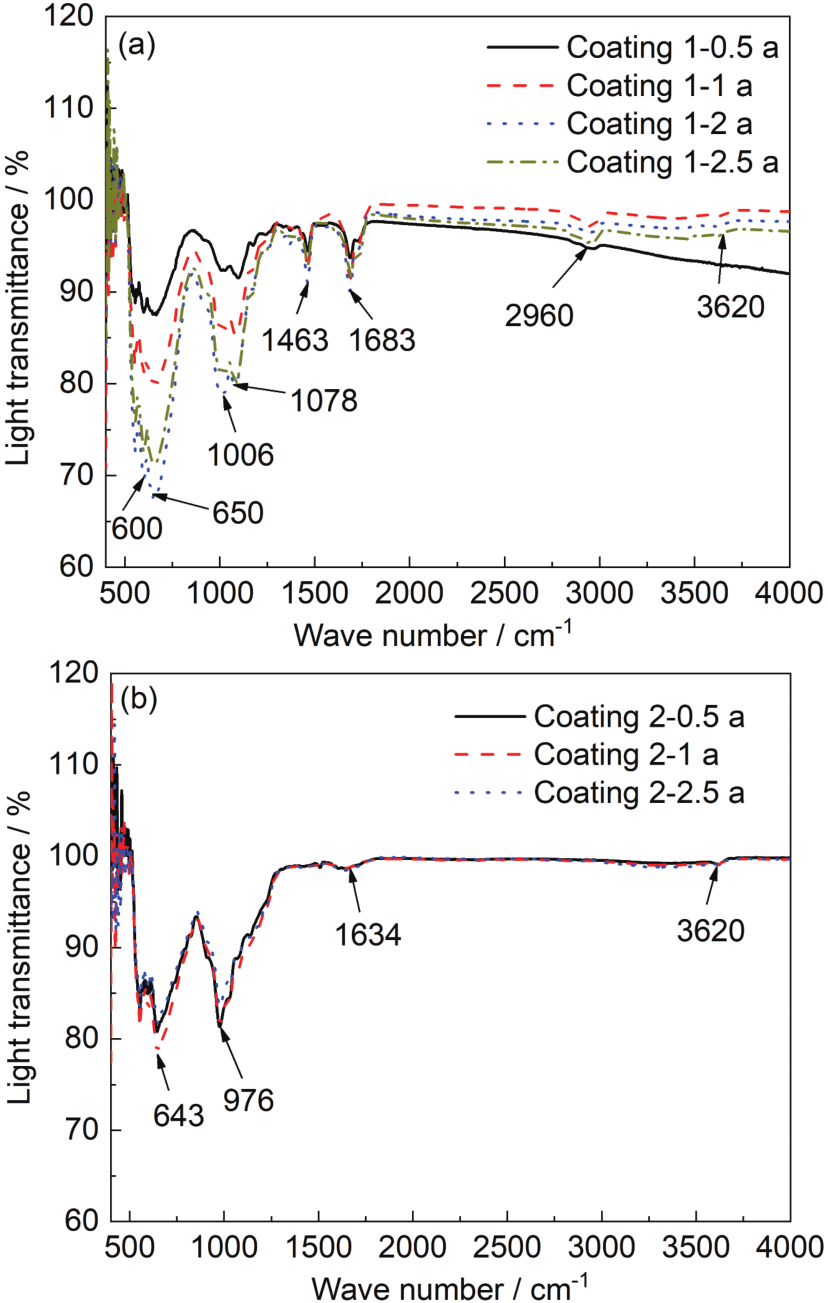 | Fig.6 Infrared spectrum analysis of coating 1 (a) and coating 2 (b) at Wanning Natural Environment Test station after different periods of exposure |