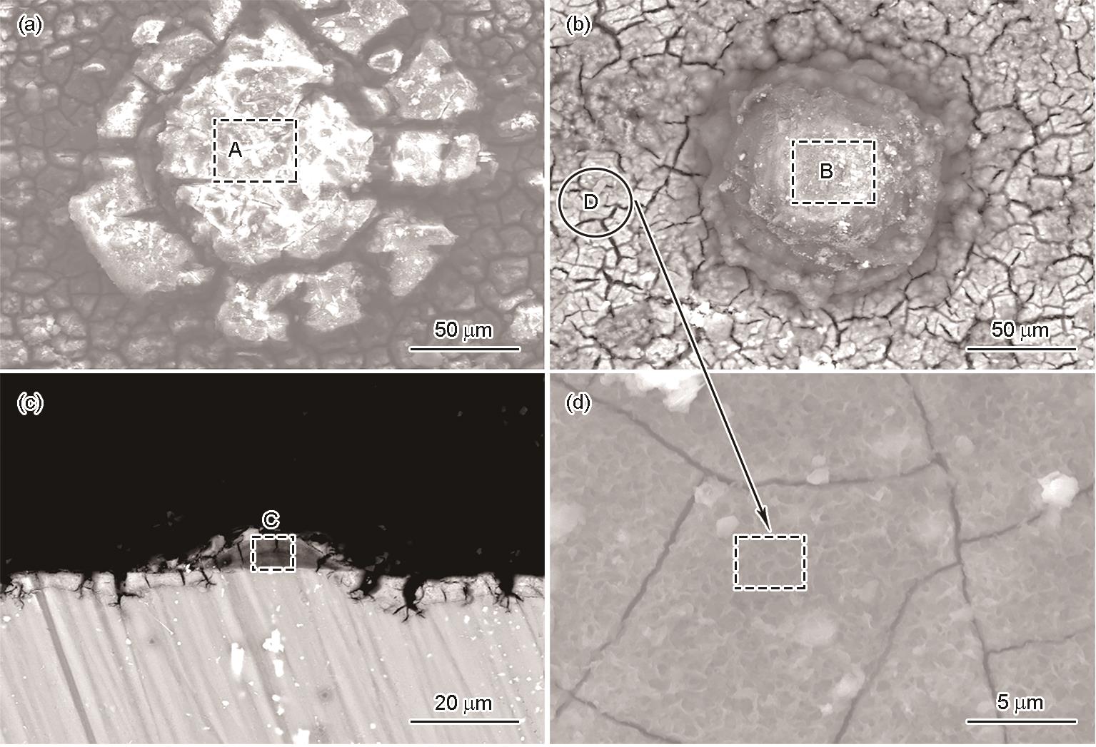 Fig.5 Morphologies of the round corrosion products formed on the extruded EW75 Mg-alloy exposed to Shenyang atmosphere for 12 months (a, b), cross-sectional morphology of the round corrosion product (c), and enlarged view of the area marked by white circle in Fig.5b (d) |