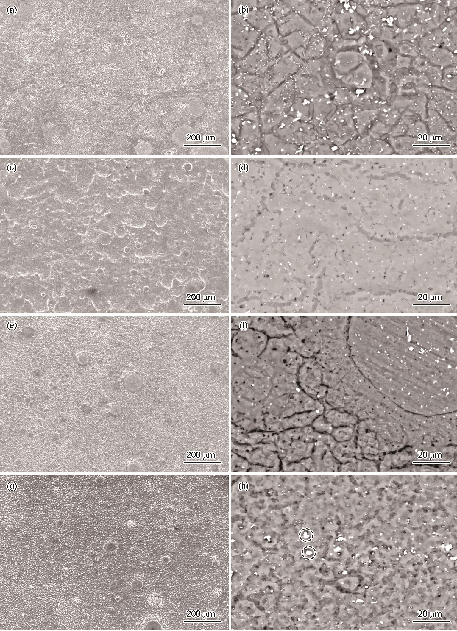 Fig.6 Surface corrosion morphologies of the extruded EW75 Mg-alloy after exposure in Shenyang atmosphere for different durations and then removing corrosion products: (a, b) 1 month, (c, d) 3 months, (e, f) 6 months, (g, h) 12 months |
