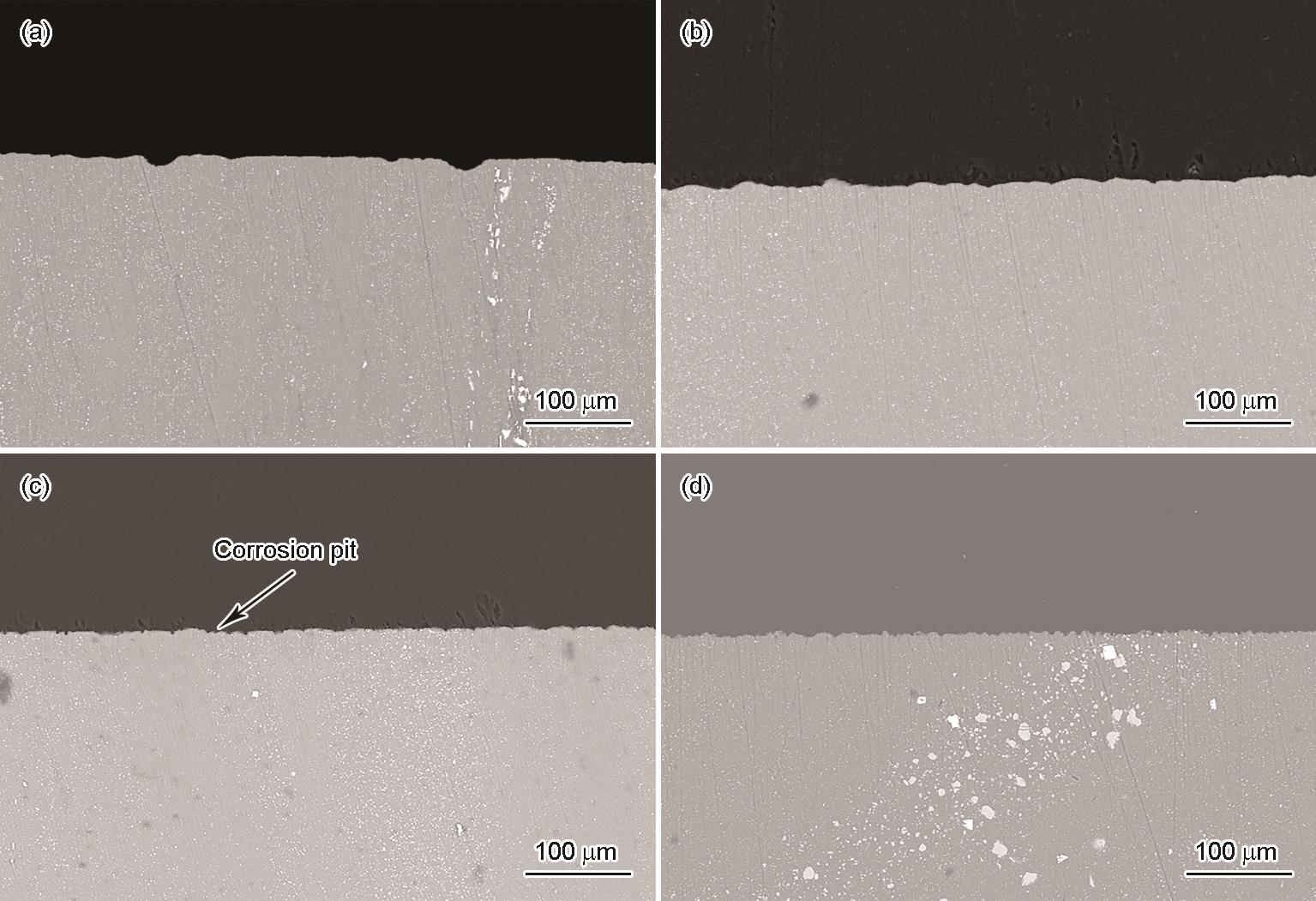 Fig.7 Cross-sectional corrosion morphologies of the extruded EW75 Mg-alloy after exposure in Shenyang atmosphere for different durations and then removing corrosion products: (a) 1 month, (b) 3 months, (c) 6 months, (d) 12 months |