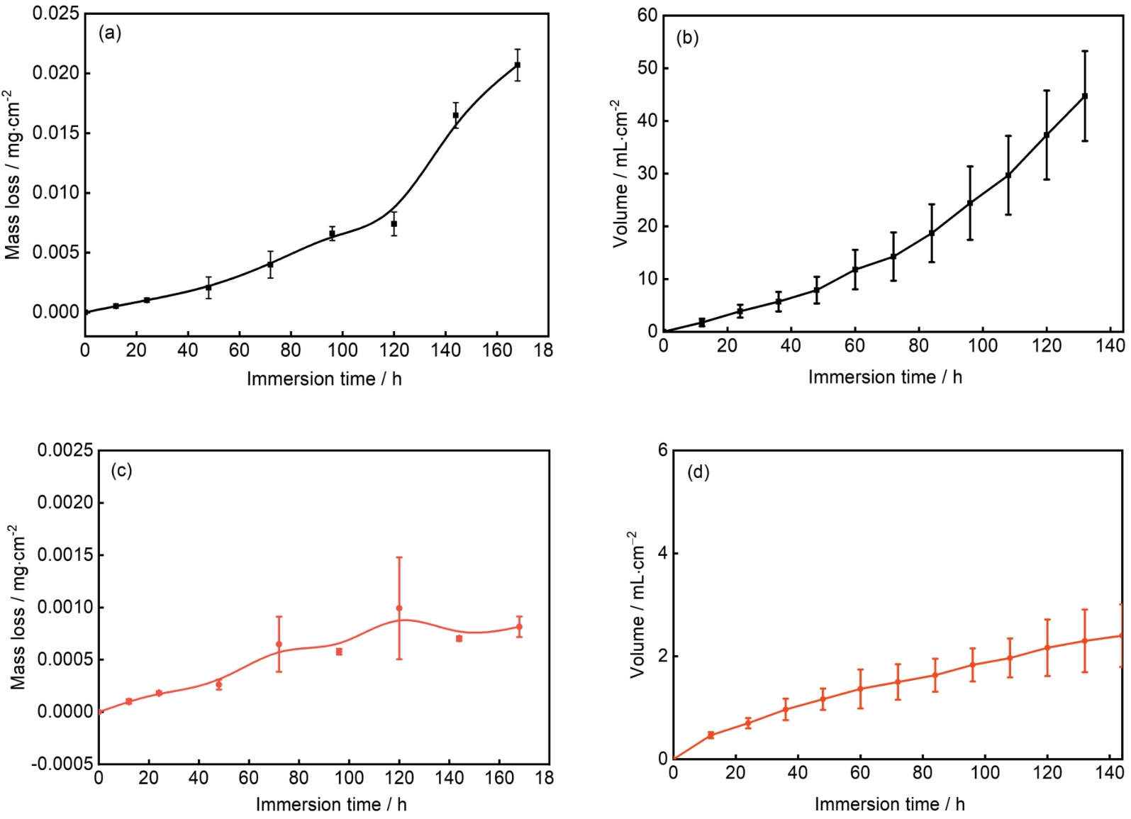 Fig.3 Mass loss (a, c) and the dependence of hydrogen evolution volume (b, d) of the cast (a, b) and rolled (c, d) ZM5 Mg- alloy during immersion in 3.5%NaCl solution |