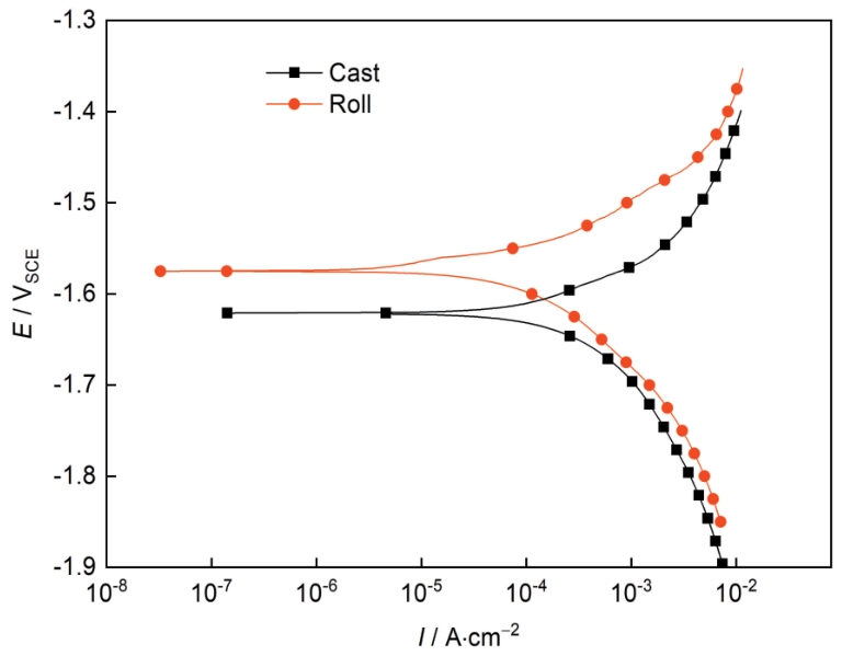 图4 ZM5镁合金轧制前后在3.5%NaCl中的极化曲线 |