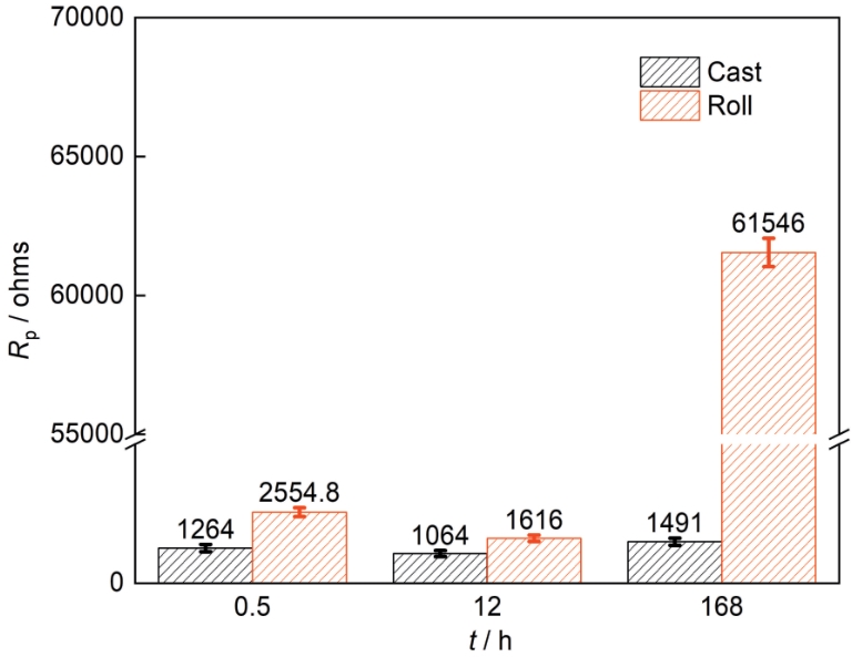 Fig.7 Rp of ZM5 Mg-alloy before and after rolling during various immersion time in 3.5%NaCl solution |