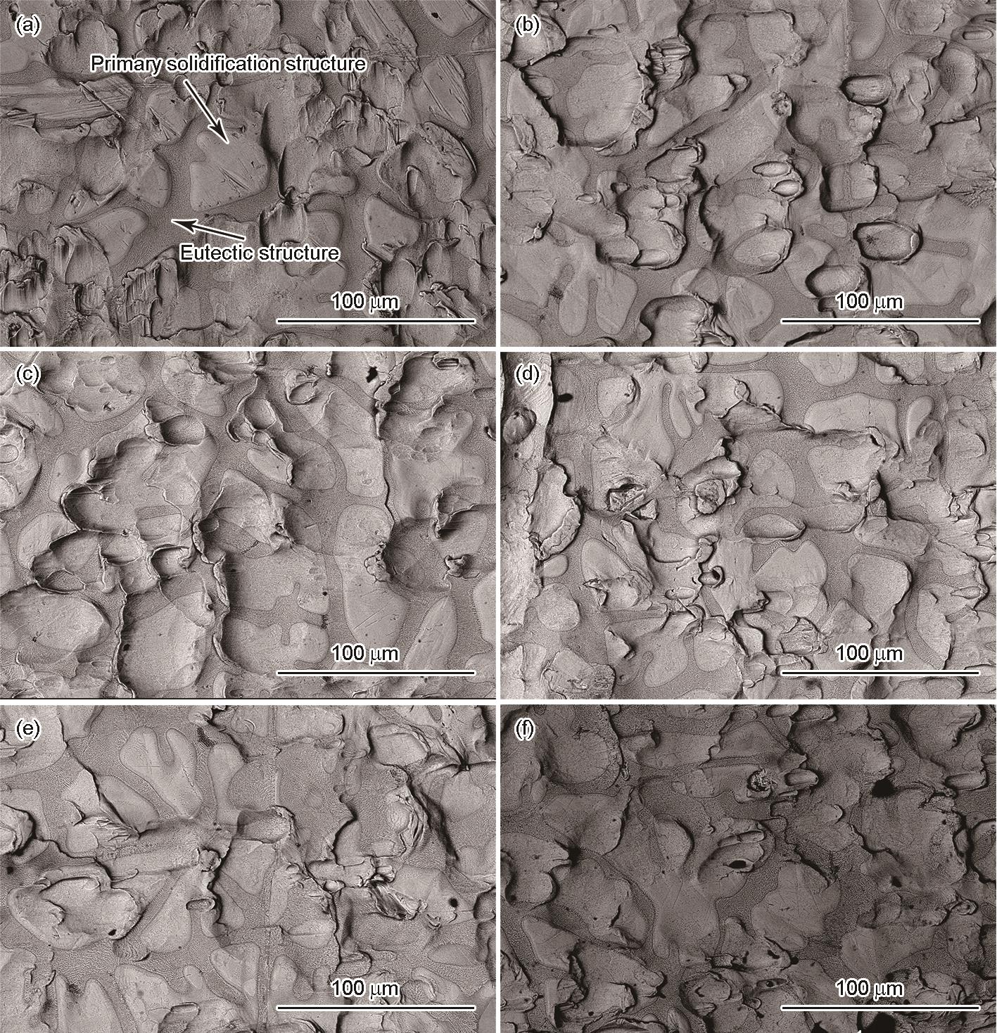 | Fig.1 Surface microstructure of ZnAlMg coating under different heat treatment temperatures: (a) as-received, (b) 150oC, (c) 175oC, (d) 200oC, (e) 225oC, (f) 250oC |