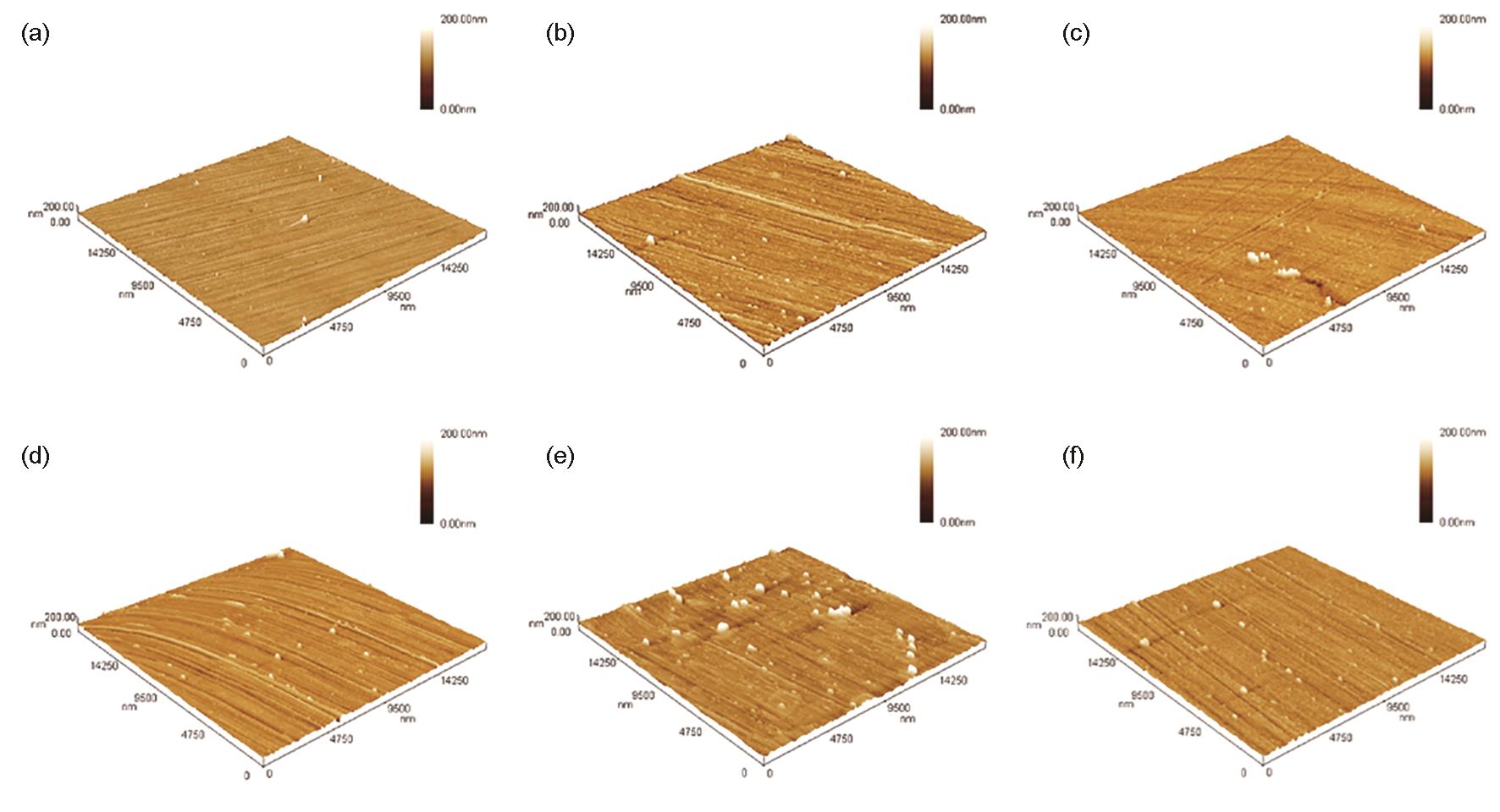 | Fig.4 AFM results of the surfaces of pure Fe after exposure in combustion environments with different contents of n-heptane: (a) 0 μL, (b) 20 μL, (c) 40 μL, (d) 80 μL, (e) 150 μL, (f) 250 μL |