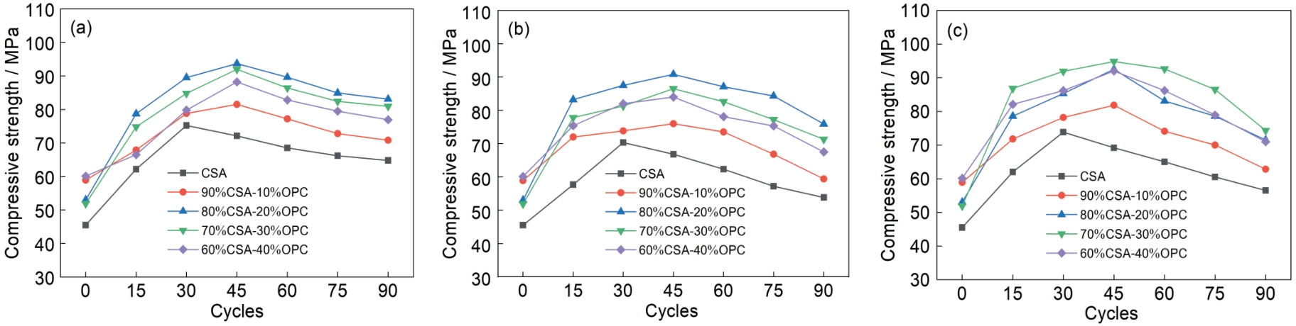 | Fig.3 Compressive strengths of CSA-OPC system during dry-wet cyclic test for 90 cycles in the corrosion solutions of N (a), N + S (b) and N + S + M (c) |