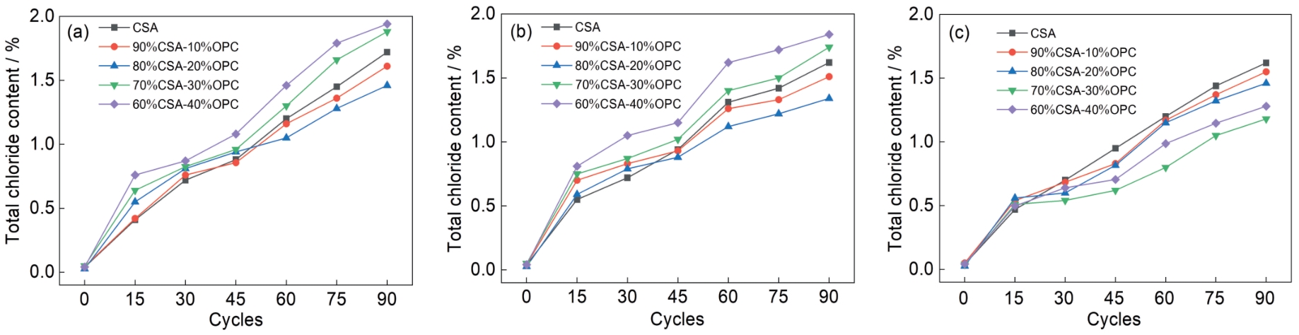 | Fig.5 Total contents of Cl- for CSA-OPC system during dry-wet cyclic test for 90 cycles in the corrosion solutions of N (a), N + S (b) and N + S + M (c) |