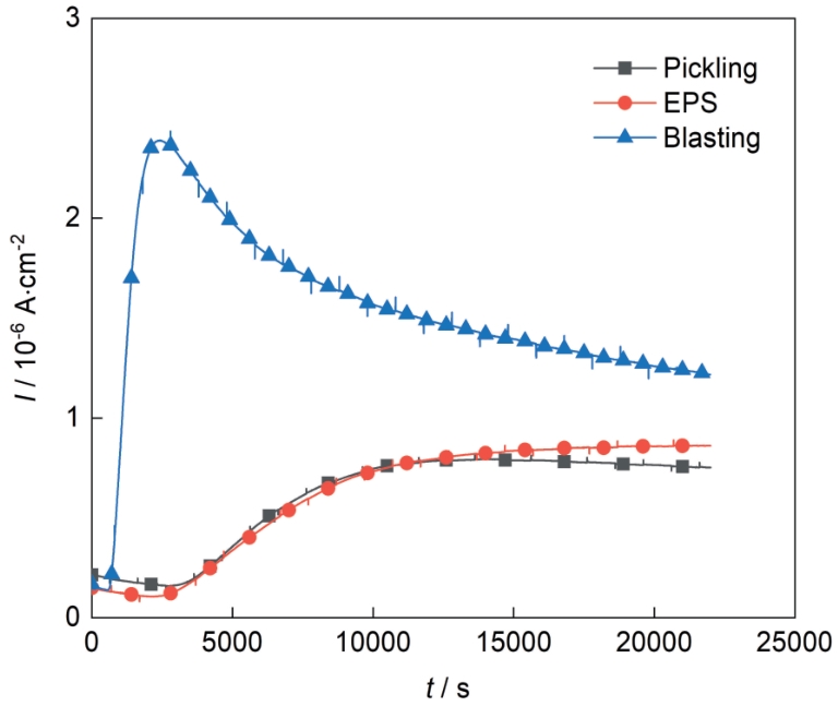Fig.9 Hydrogen permeation curves of QStE700TM steel with different surface treatments |