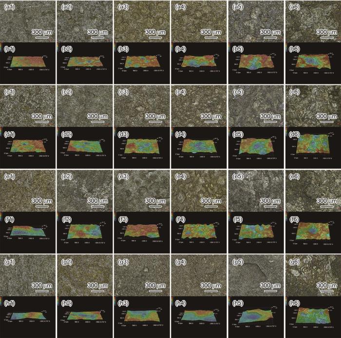 2D (a, c, e, g) and 3D (b, d, f, h) corrosion morphologies of Q235B steel after removal of the rust layers formed in the atmosphere (a, b) and the zones above the waterline (c, d), below the waterline (e, f) and under water (g, h) for 0.5 a (a1-h1), 1 a (a2-h2), 2 a (a3-h3), 3 a (a4-h4), 4 a (a5-h5) and 7 a (a6-h6)