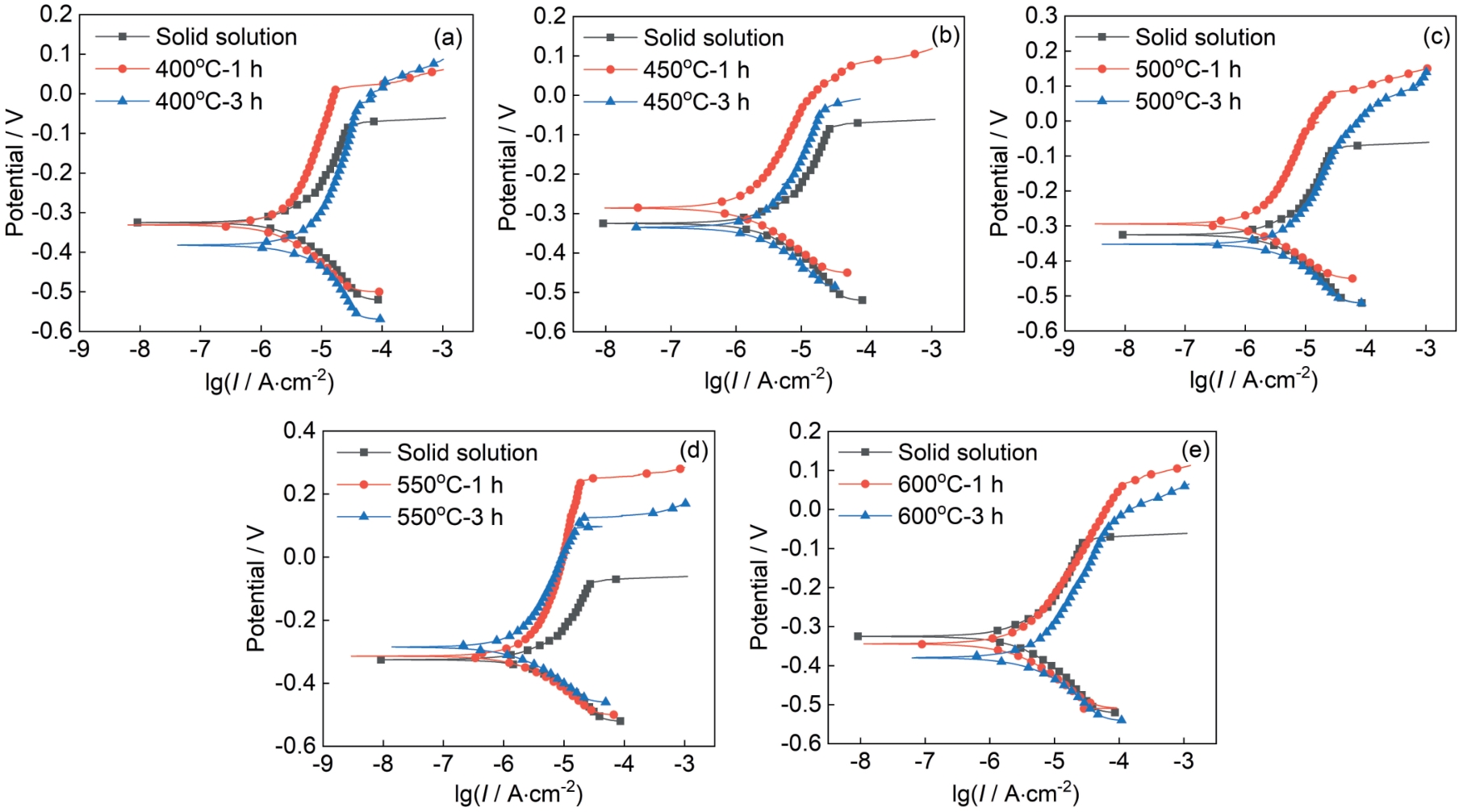 Fig.8 Polarization curves of Custom455 steel aged for 1 and 3 h at 400oC (a), 450oC (b), 500oC (c), 550oC (d) and 600oC (e) |
