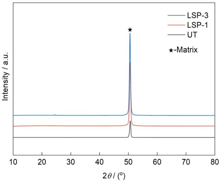 ... 图3显示了UT、LSP-1和LSP-3试样沿深度方向的显微硬度变化规律.UT试样的平均显微硬度约420 HV,而LSP-1和LSP-3试样表面的显微硬度分别为495和590 HV,比UT试样分别提高了17.85%和40.5%.随着测量深度增加,表面显微硬度也逐渐下降.根据测量硬度提升的范围可知,LSP-1试样约有1 mm的硬化层,LSP-3试样的硬化层达到1.5 mm.LSP试样的显微硬度得到明显提升,这主要是位错强化的作用.图2显示了LSP后表面的微观结构变化,随着冲击次数增加表面位错密度也增加,表面显微硬度也得到提高,这与Hall-Petch theory的研究[25]相吻合. ...