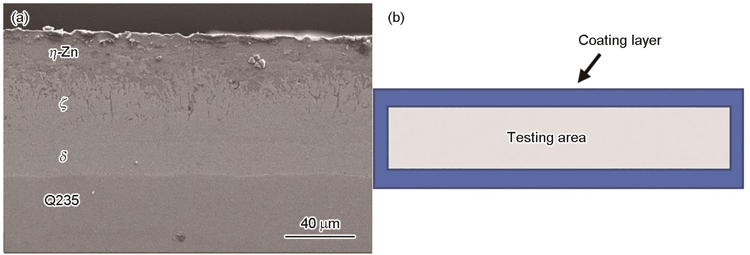 Fig. 1 Cross-sectional morphology of galvanized Q235 steel plate (a) and schematic diagram of the stress corrosion sample (b) |