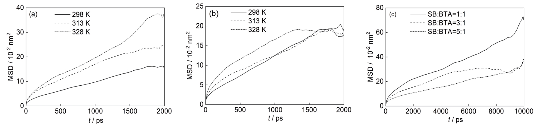 Fig.8 MSD of LDPE self-diffusion in different diffusion systems: (a) BTA-LDPE, (b) SB-LDPE, (c) BTA-SB-LDPE |