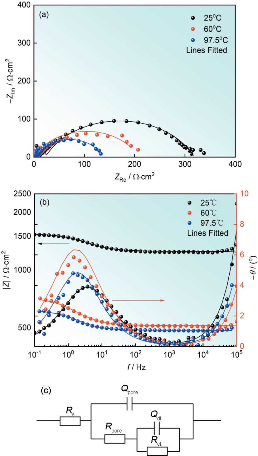 Fig.2 Nyquist (a) and Bode (b) plots of 42CrMoE steel in 8800 mg/L boric acid solution at different temperatures and equivalent circuit diagram (c) |