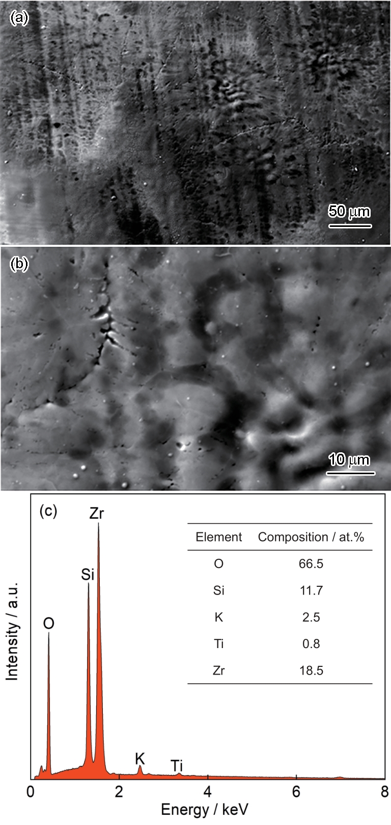 | Fig.1 SEM images (a, b) and EDS analysis (c) of as-prepared Zr-SiO2 composite coating |