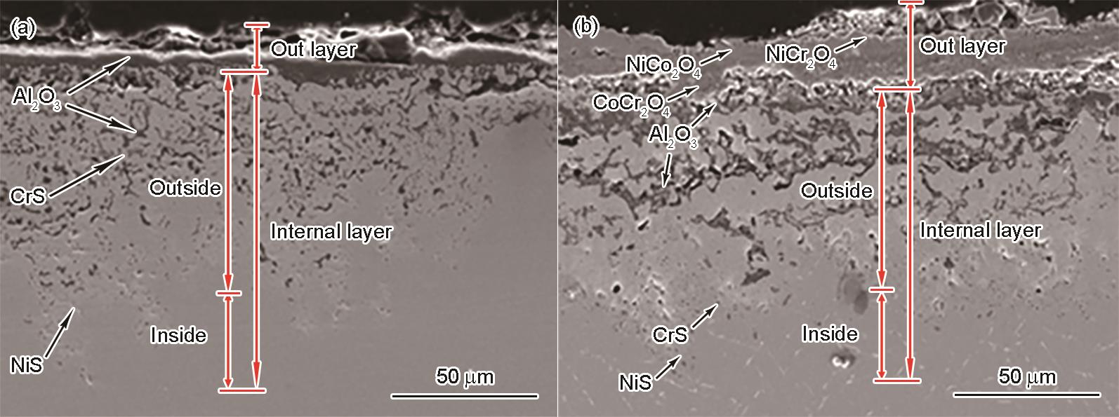 Fig.8 Cross-sectional morphologies of CH (a) and CH-LA (b) alloy samples after hot corrosion at 900oC for 100 h |