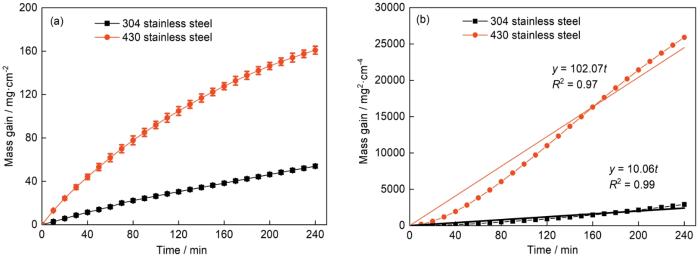 Variations of mass gain (a) and square of mass gain (b) with time for 304 and 430 stainless steels during oxidation in air at 1240oC for 4 h
