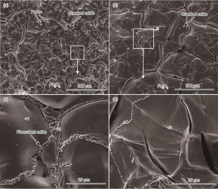 Surface morphologies of 304 (a, c) and 430 (b, d) stainless steels oxidized in air at 1240oC for 4 h