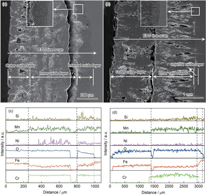 Cross-sectional morphologies (a, b) and EDS line scannings (c, d) of 304 (a, c) and 430 (b, d) stainless steels oxidized at 1240oC in air for 4 h