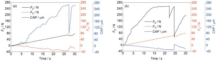 经1240℃空气中4 h氧化的304和430不锈钢划痕实验中摩擦力和划痕深度随加载力的变化曲线