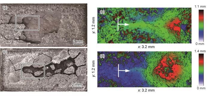 图6为304和430两种不锈钢划痕深度(CAP)、摩擦力(Fx)随加载力(Fz)变化曲线。图7为两种不锈钢的划痕形貌,划痕的三维形貌(图7b和d)不同颜色代表不同深度,在实验过程中确定剥落位置后,3D划痕仪可根据剥落位置实时测量剥落深度。由图6a可知,当加载力小于57 N时,304不锈钢的曲线基本无波动;加载力加至57 N时,划痕深度突然减小。对照图7a和b的划痕形貌,观察到少量氧化皮出现破裂翘起。从关系曲线可得划痕深度约为253 µm,与图5a中所测的外氧化层厚度吻合,说明内外氧化层层间的破坏引起划痕深度的变化。因此,内外氧化层的层间临界结合力为57 N。随着加载力的进一步增大,翘起的氧化皮被压碎,划痕深度又迅速增加。当加载力加至62 N时,划痕深度又一次出现较大的变化,同时摩擦力和加载力曲线也出现了较大波动。观察划痕表面,发现大块氧化皮出现剥落,测得剥落深度约为800 µm(图7b红色区域),与图5a中内外氧化层的平均厚度吻合。因此,氧化皮与基体的临界结合力为62 N。对于430不锈钢,当加载力小于70 N时,各曲线基本无波动,如图6b所示。当加载力加至70 N时,加载力、划痕深度和摩擦力均出现较大波动,此时划痕深度约为265 µm,测得氧化皮剥落深度约为1000 µm(图7d红色区域),与图5b中外氧化层的平均厚度基本一致,说明外氧化层剥落。因此,内外氧化层的层间临界结合力为70 N。以上结果表明430不锈钢氧化皮与基体的结合力大于304不锈钢。