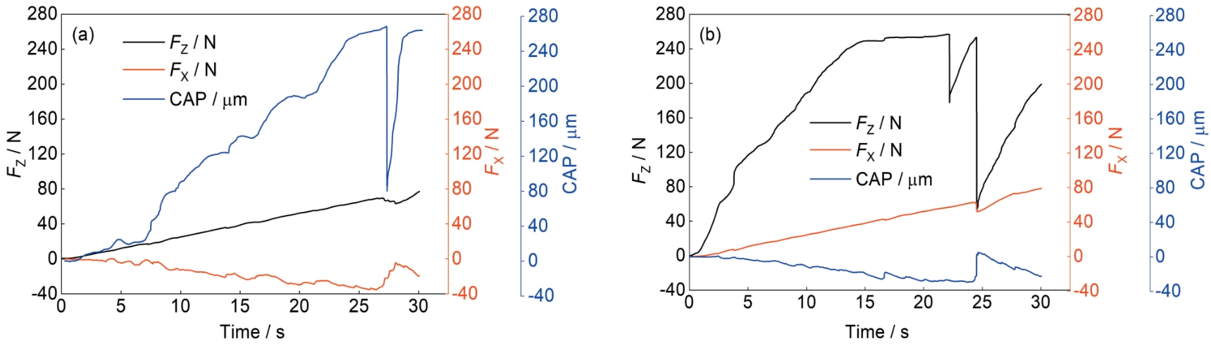 图6 经1240℃空气中4 h氧化的304和430不锈钢划痕实验中摩擦力和划痕深度随加载力的变化曲线 |