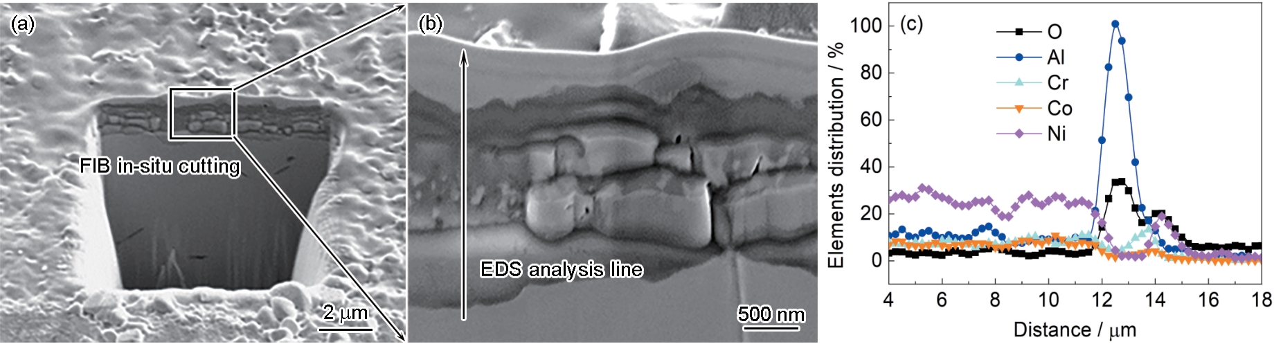 | Fig.10 Cross-sectional morphologies of the alloy specimen oxidized at 1000 oC for 40 h (a, b), and element distributions along the marked line in Fig.10b (c) |