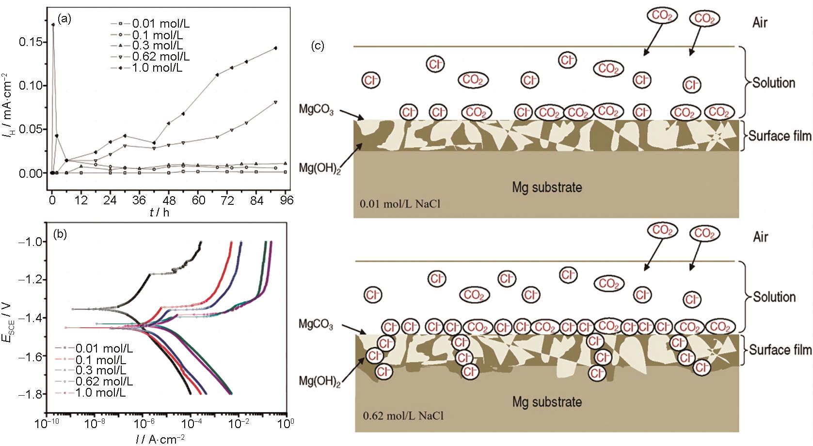 | Fig.3 Electrochemical performances of AM60 alloy in thesolutions containing different concentrations of Cl-: (a) corrosion current density curves, (b) polarization curves, (c) corresponding corrosion models[ |