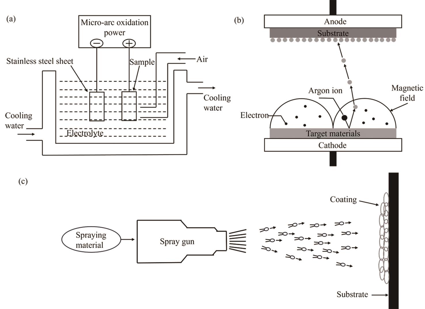 | Fig.5 Principle diagrams of surface treatment technologies: (a) micro-arc oxidation, (b) magnetron sputtering, (c) thermal spraying |
