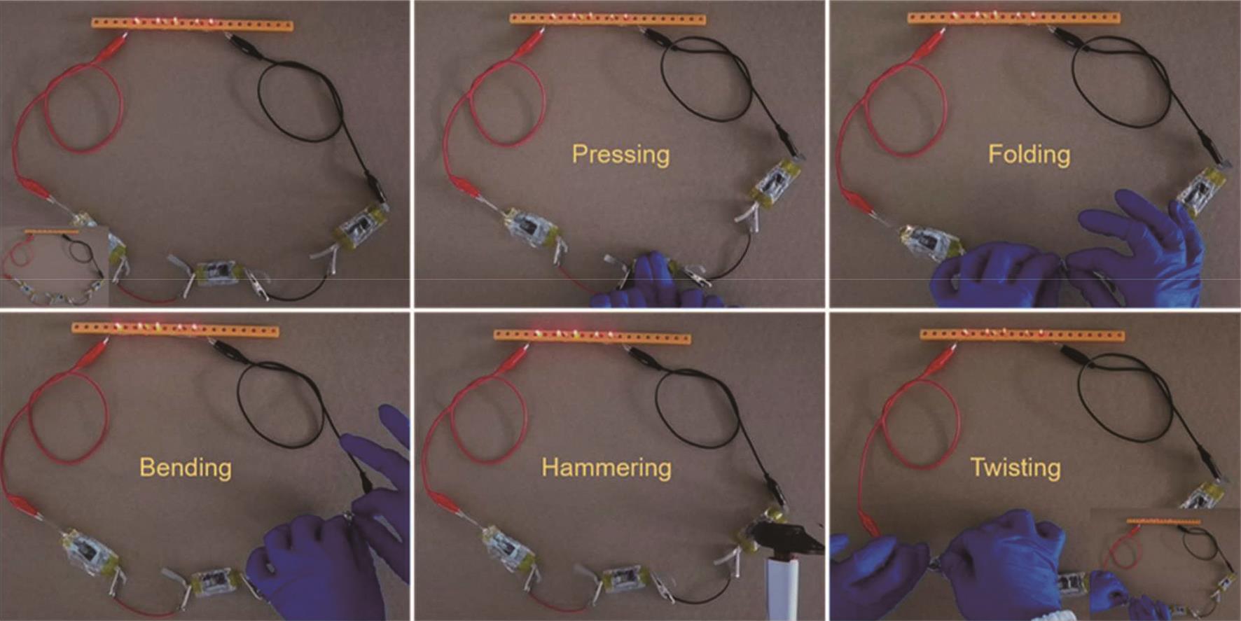 | Fig.11 Flexible ZIBs successfully power LEDs under various dynamic deformations, including pressing, folding, bending, hammering and twisting[ |