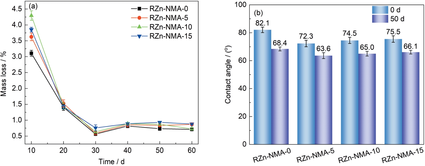 | Fig.5 Mass losses of RZn-NMA-X polymer coatings during immersion in seawater for 60 d (a), and changes of contact angle for the coatings before and after 50 d soaking (b) |