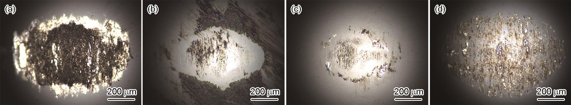 | Fig.10 Wear scars of Si3N4 balls under dry sliding and tribocorrosion in 3.5%NaCl conditions: (a) dry sliding, (b) OCP, (c) -1.5 VAg/AgCl, (d) -0.7 VAg/AgCl |